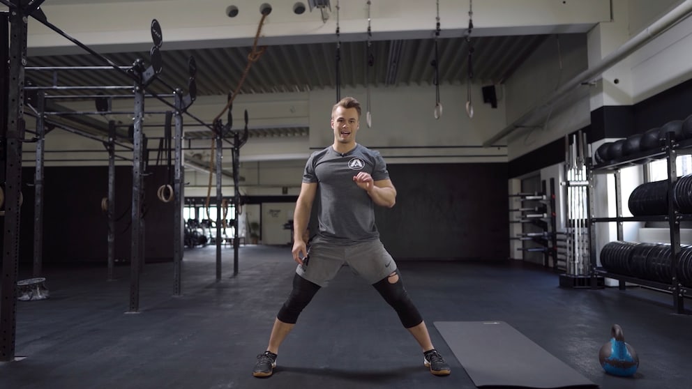 The warm-up part in the Crossfit universe consists of 5 Cossack Squats per side (an intense mobility exercise for the hips from a wide stance), 10 deep squats held briefly, and the Swimmer (10 repetitions): Lying on your stomach, move your arms in a large motion behind your back and head.