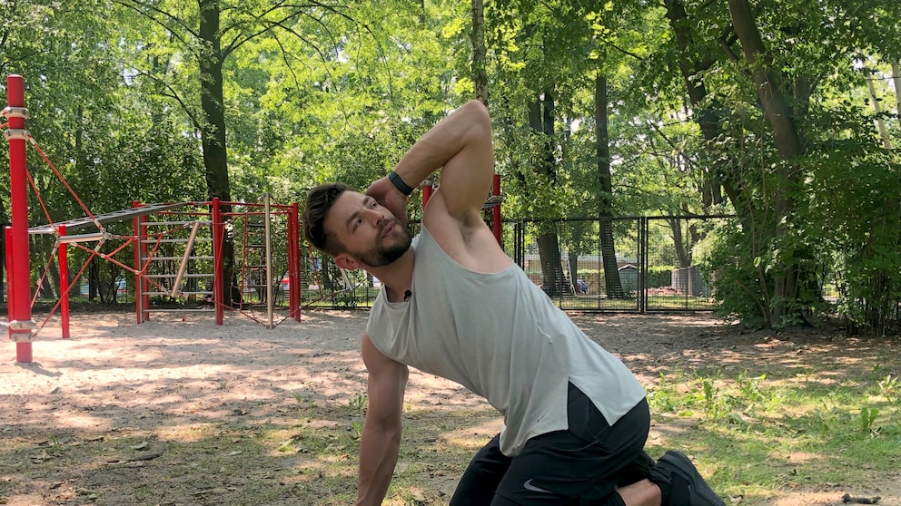 It’s important to mobilize the upper part of the spine as well. Place one hand on the back of your head. Now alternately move the elbow of the raised arm downward (inhale) and rotate it upward (exhale). Go as far as possible in both directions and follow the elbow with your gaze. Important: Keep your hips stable! The rotation comes from the spine. Do six to eight repetitions.