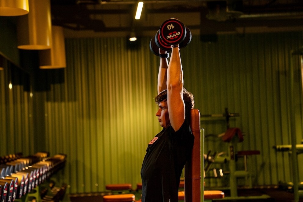 - Press the dumbbells from the starting position upward in a controlled and powerful manner. The movement follows a slight arc until the arms are almost fully extended, without locking the elbows at the top. Ensure the dumbbells do not collide at the top.