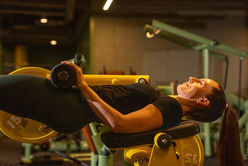 Too often, German gyms lack a hip thrust machine. And even if one is available, many prefer the free variant with the barbell or at the Smith machine. However, the hip thrust can also be performed without special equipment. For beginners, the floor variant is suitable: Lie on your back, bend your knees so that your feet are flat on the floor, place the weight on your pelvis, and push your hips up until your knees, hips, and shoulders form a straight line. If you want a greater range of motion, support your upper back on a bench, which allows for a deeper starting position and thus a more complete movement.