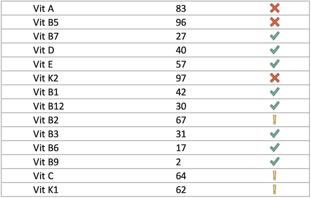 The result report comes via email. I found it pleasant not to have to download an extra app for the vitamin self-test. However, the scope was a bit overwhelming: 34 pages! At the beginning is an overview of the nutrients—you couldn’t choose one specifically when sending it in, but you get a pre-set package analyzed. This data sheet uses a simplified traffic light system to indicate whether a deficiency is present. The surprise: A green checkmark appears next to vitamin B12—after the other two tests, this is rather unlikely and a sign that the analysis is not very reliable.