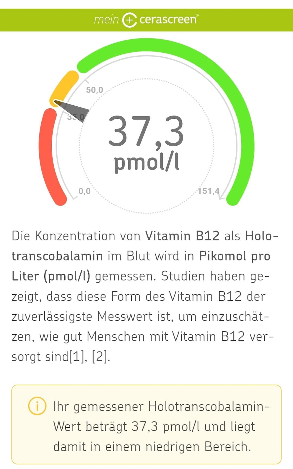 I received the result three days later via the app (according to the instructions, it takes up to five days). Graphically presented, I learned that my HoloTC is in the low range. I also received ads for a vitamin B12 spray and the offer of a free phone consultation if I had questions about my results. The supplement is significantly lower-dosed than what my doctor recommended: 25 micrograms per spray (versus 1,000 micrograms per tablet).